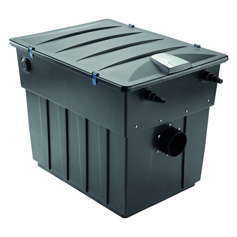 Menší mechanicko-biologická filtrace s posuvným automatickým sítem na zachycení hrubých nečistot.Na dně filtru je odkalovací ventil pro snadné čištění.Filtr má vstupy upravené pro snadnou montáž UV lampy Bitron.